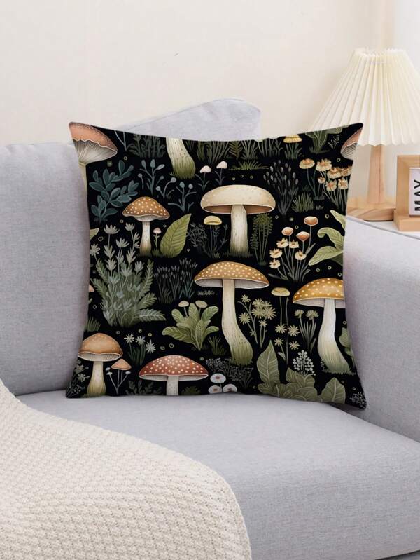 1pc Plant & Mushroom Pattern Pillowcase, Modern Style Printed Velvet Fabric Cushion Cover For Home Decor, Sofa, Bedroom