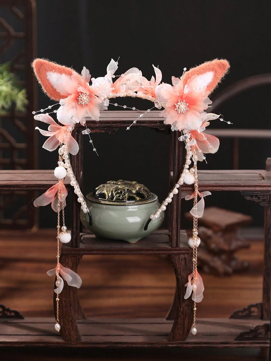 1pc Rabbit/Fox/Cat Ear Plush Ball Hair Hoop For Girls' Chinese Traditional Hanfu Hair Accessories Vintage Style