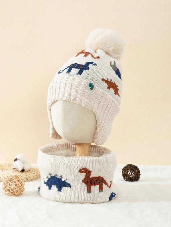 1pc Random Cut Lovely Dinosaur Pattern Colorful Cap With Ears Protection, Plus 1pc Random Cut Thickened Dinosaur Print Colorful Winter Scarf For Boys/girls