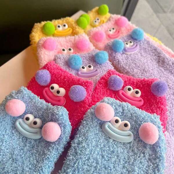 1pc Randomly Shipped Cute Ugly Sausage Mouth Big Eye Socks, Unisex, Dopamine Girl Style, Coral Fleece Mid-Calf Plush Pile Socks For Home