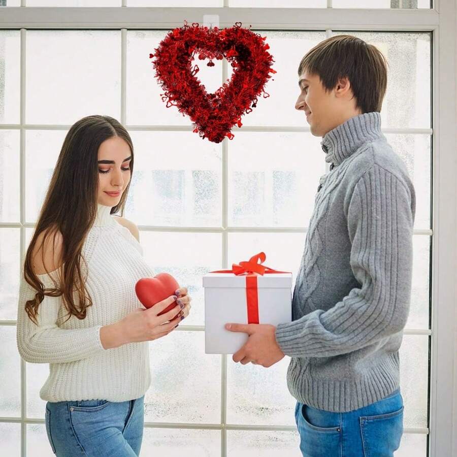 1pc Red Heart Shaped Flower Wreath For Valentine'S Day, With Aluminum Foil Heart Shaped Hanging Decoration For Wedding, Birthday, Party, Home, Fireplace Decor (Lights Not Included)