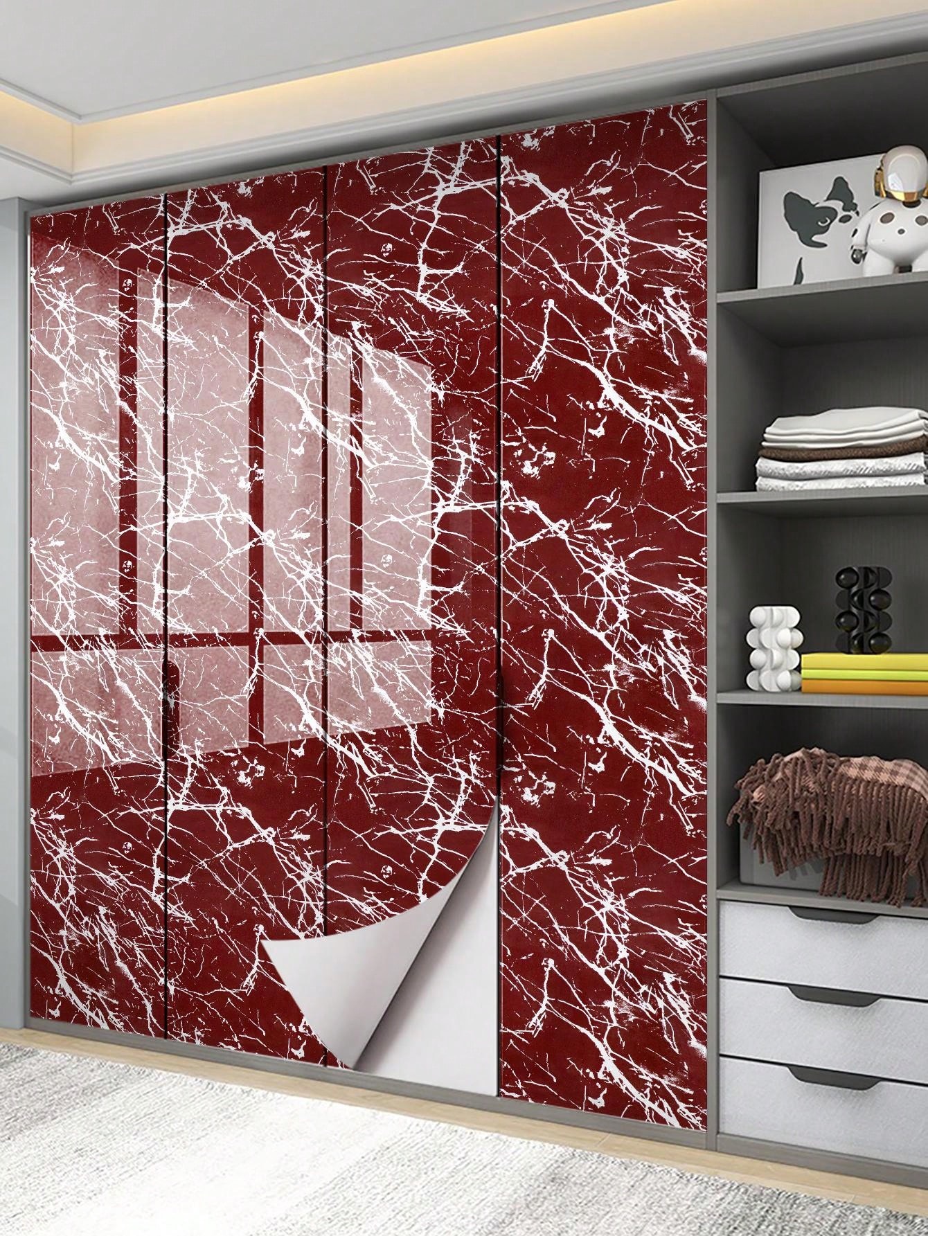 1pc Red Marble Pattern Kitchen Waterproof & Oil-proof Glossy Self-adhesive Drawer & Home Protective Film, Tabletop & Stove Top & Moistureproof Self-adhesive Refurbishment Film, Marble Pattern Wallpaper