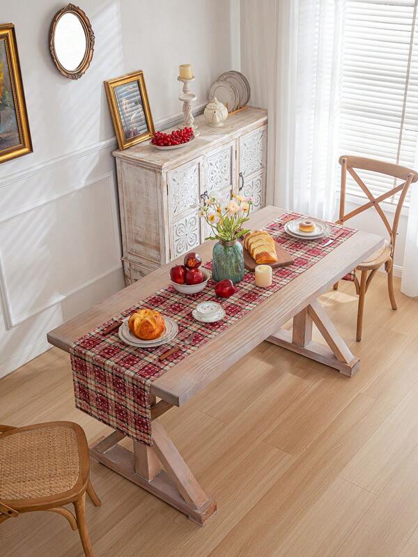 1pc Red Plaid Christmas Table Flag With Snowflake Pattern, Indoor Use