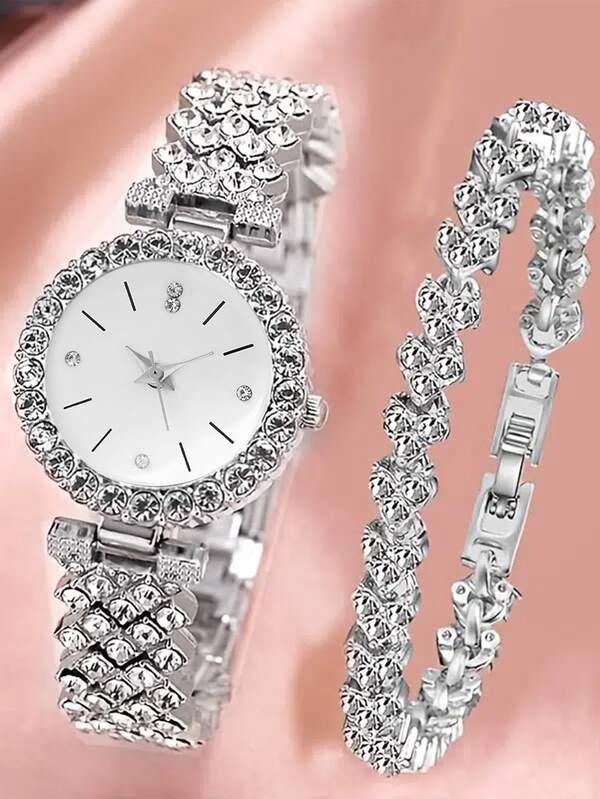 1pc Rhinestone Decor Quartz Watch & 1pc Bracelet