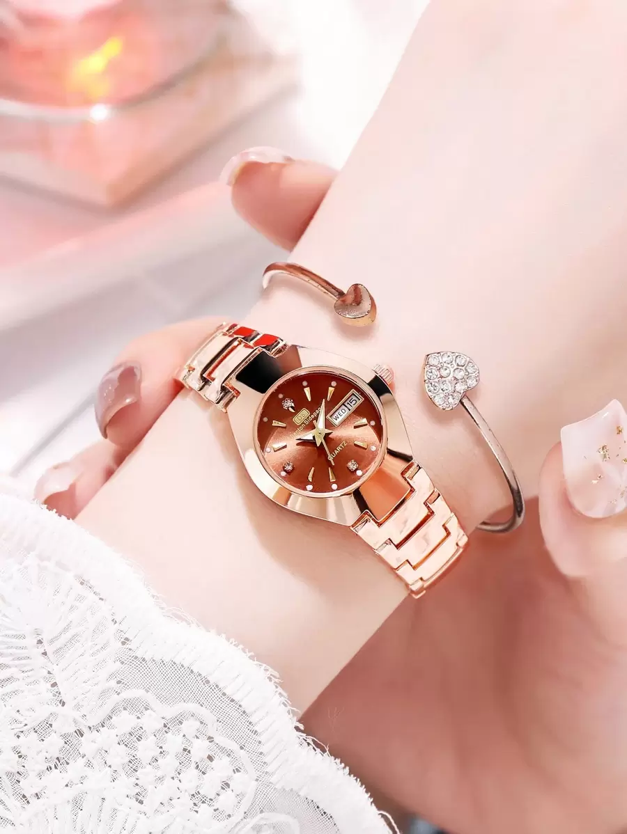 1pc Rhinestone Decor Round Pointer Quartz Watch & 1pc Bracelet
