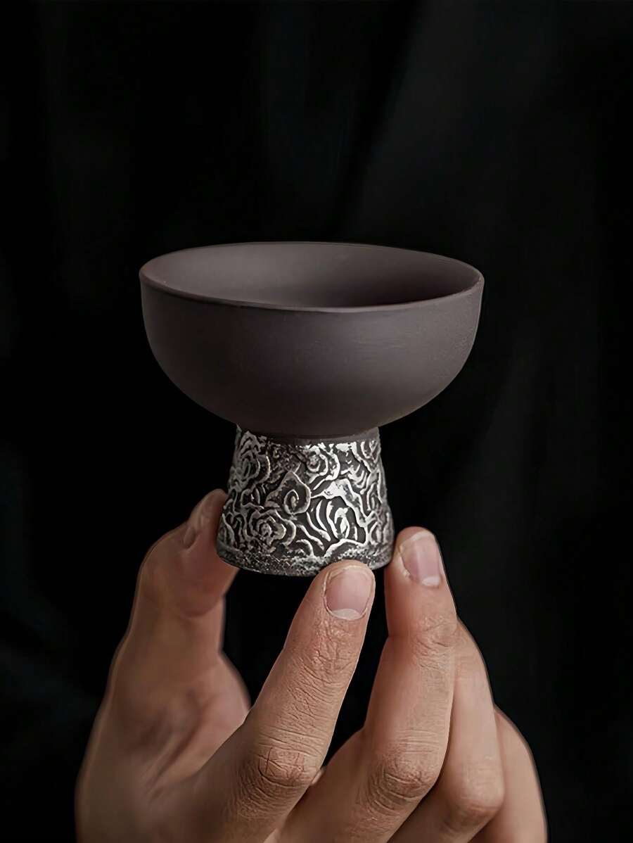 1pc Round Mouth Tall Foot Tea Cup, Japanese Kujaku Shouyun Pattern Coarse Pottery Cup, Vintage Handmade Silver-Plated Tea Cup For Living Room, Tea Shop And Home Life