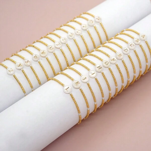 1pc Seashell & Miyuki Beaded Alphabet Detail Adjustable Bracelet With Metallic 26 Letters Charms