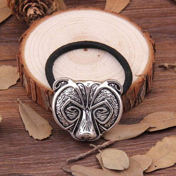 1pc Silver Punk Viking Style Bear Head Hair Tie/ Band, Personality Animal Head Elastic Rope For Daily Wear