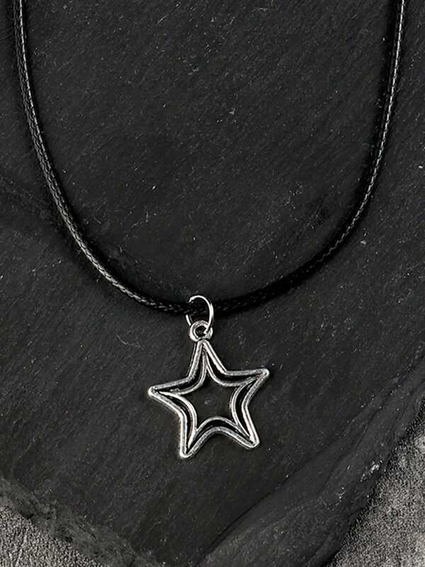 1pc Simple All-Match Woven Black Leather Corded Necklace With Hollow Star Pendant For Women
