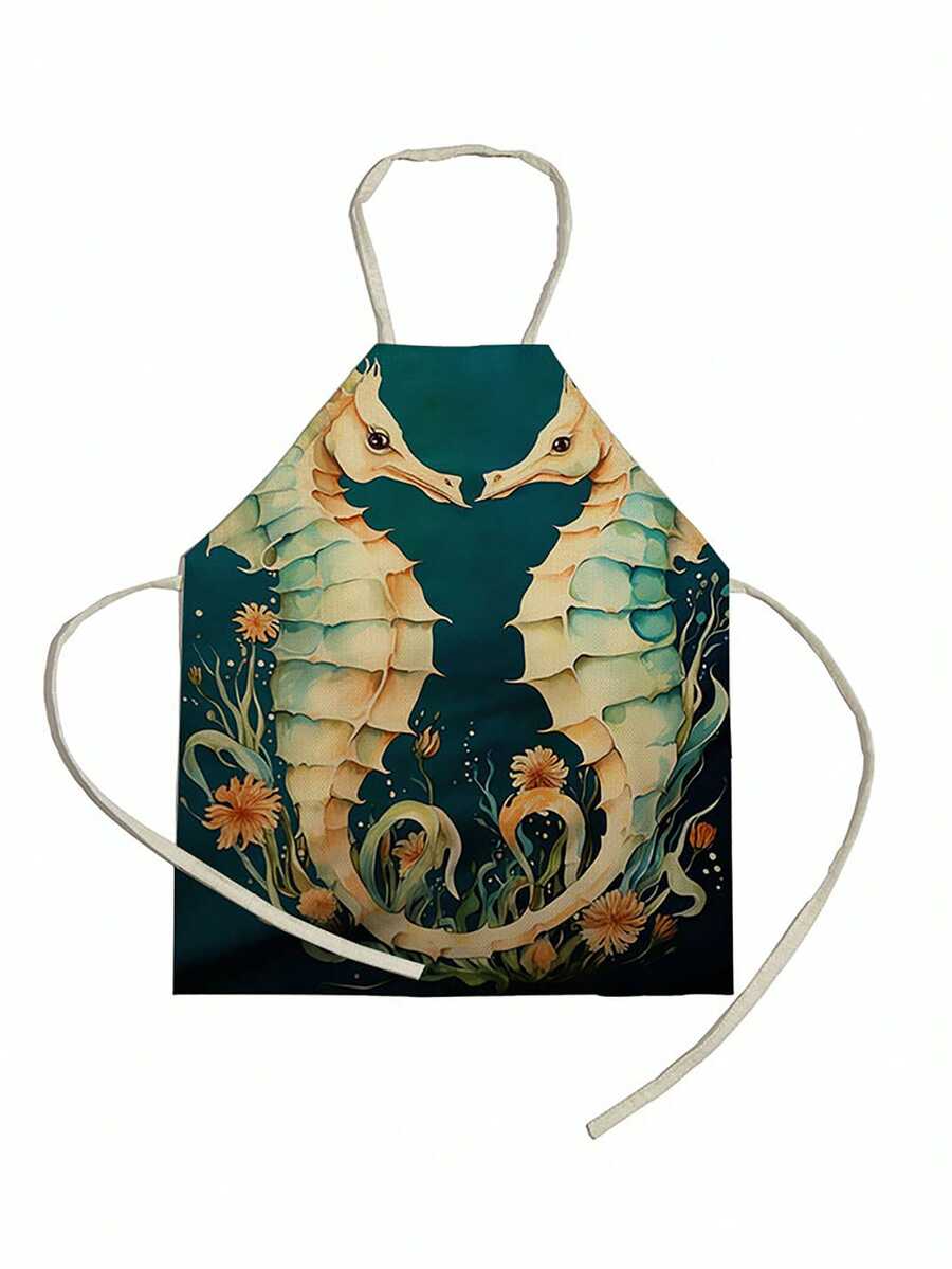1pc Single Side Printed Linen Apron With Seahorse Pattern