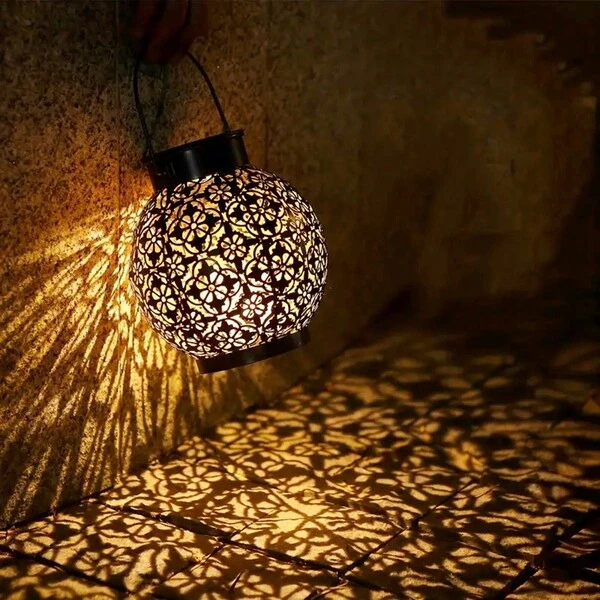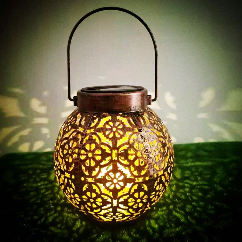 1pc Solar Powered Hanging Lamp For Christmas Outdoor Garden Yard Decoration, Iron Hollow Design, Retro Handle, Waterproof, For Garden Fence Lawn Decoration