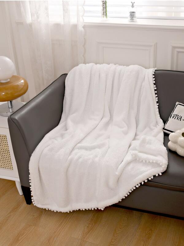 1pc Solid Color Faux Flannel Double Layer Thickened Lace Fringe Ball Blanket