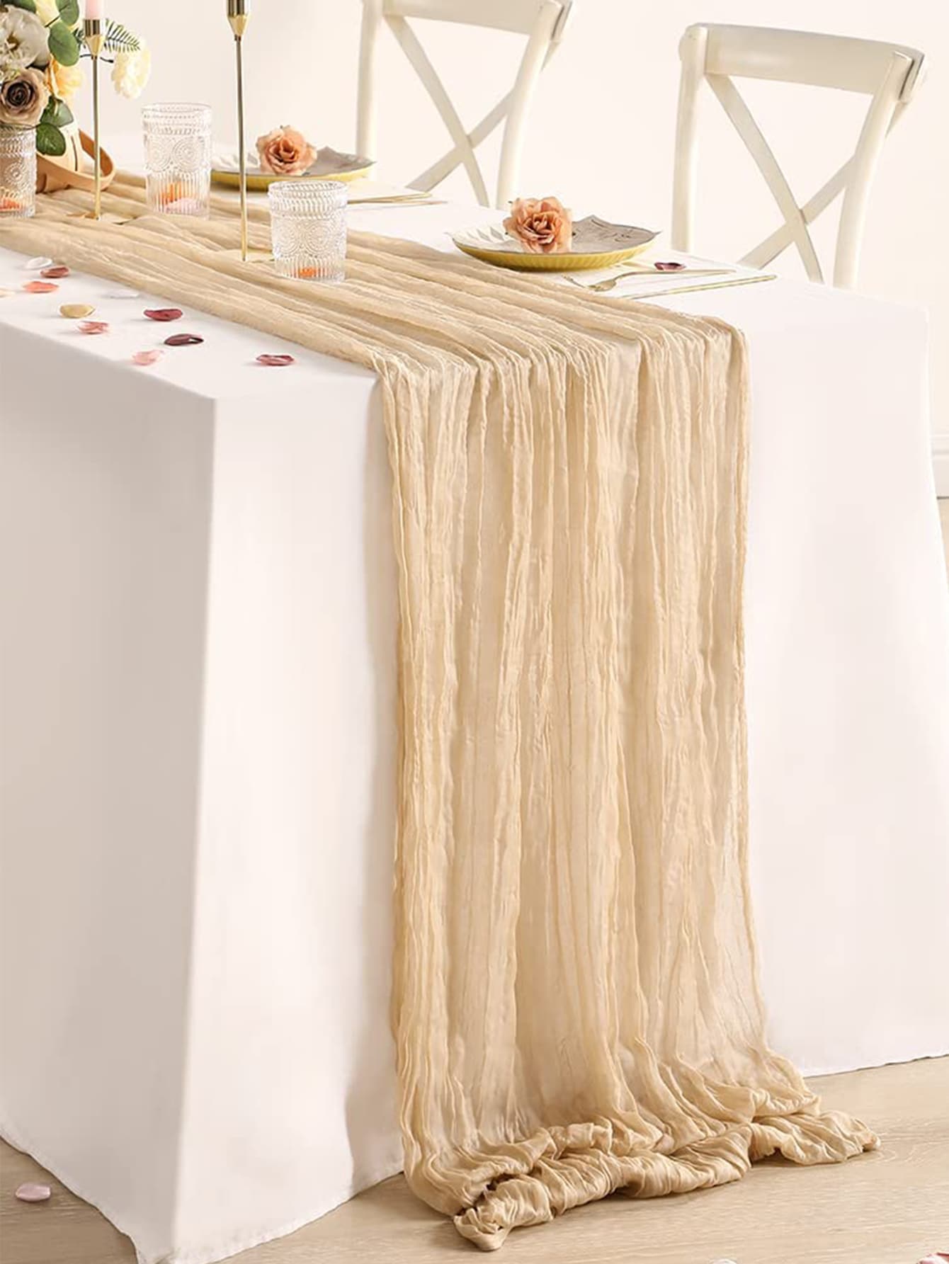 1pc Solid Color Table Runner, Beige Simple Polyester Crinkle Table Mesh, For Home Party Holiday Decor