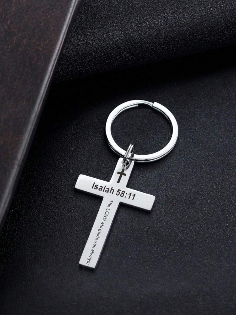 1pc Stainless Steel Cross Keychain With Slogan And Bible Verse Key Ring Isaiah 58:11