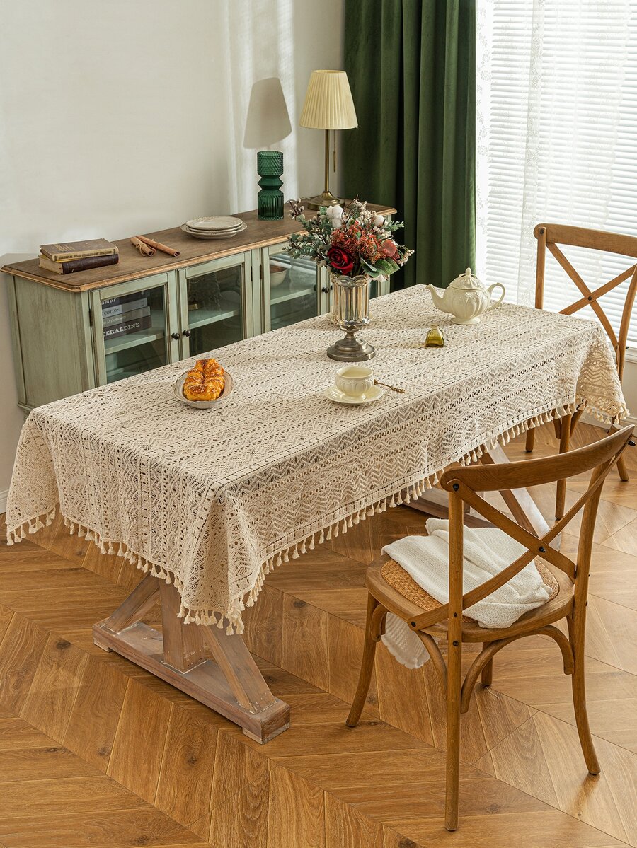 1pc Tassel Decor Hollow Out Tablecloth