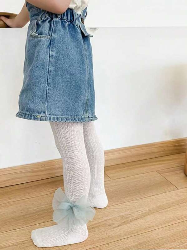 1pc Toddler Girls' Spring And Autumn New Solid Color Lace Bowknot Knit Mesh Tights, Cute And Suitable For Daily Wear