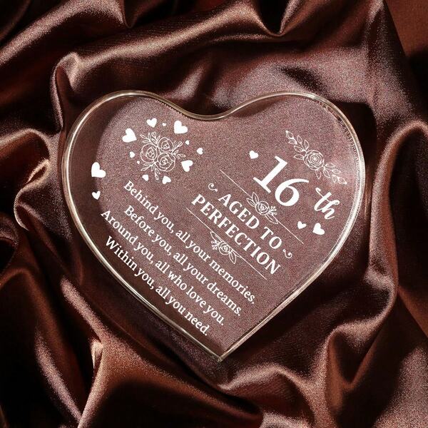 1pc Transparent Acrylic Heart-Shaped Decorative Souvenir With Patterned Text, Desk Decoration, Birthday Gift, Home Decoration Ornament,
