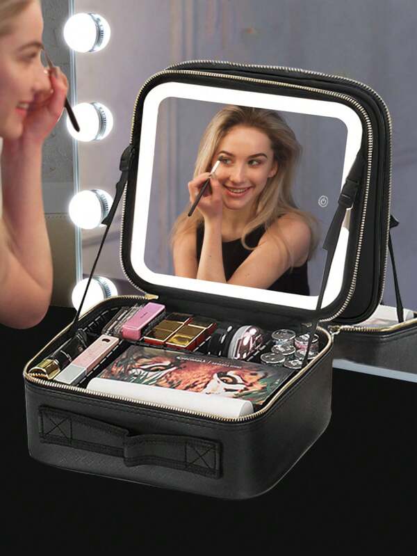 1pc-Travel Makeup Bag With Mirror Large Capacity Cosmetic Storage Box Travel Portable Makeup Bag Case With LED Light Mirror Makeup Accessories