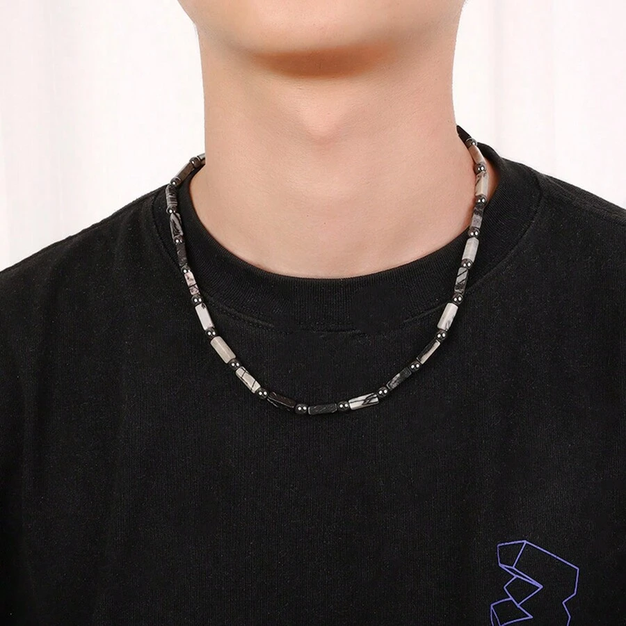 1pc Vintage & Luxurious Black Natural Stone Bead Necklace For Men, Simple & Cool Hip-Hop Gothic Style Jewelry