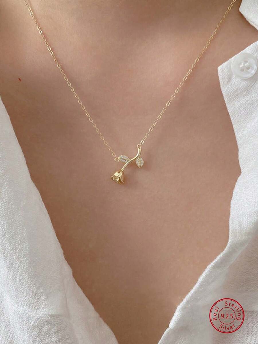 1pc Vintage & Versatile S925 Silver Plated With 14k Gold Rose Flower Pendant Necklace, Women's Gift Accessory