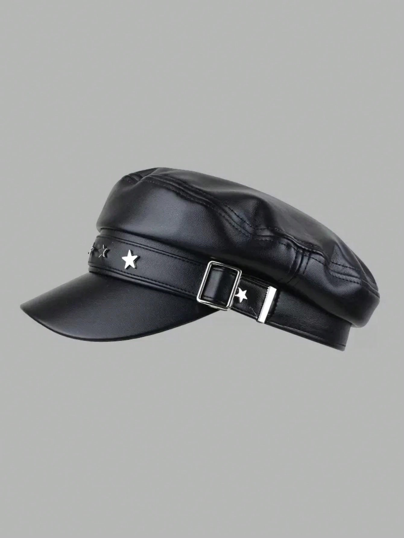 1pc Vintage British Style Beret Hat For Women, Black Color, Star Decor Pu Leather Octagonal Cap