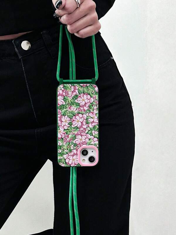 1pc Vintage Floral & Green Leaf Pattern Phone Case With 1pc Crossbody Shoulder Strap, 1pc Pink Lens Ring & 2pcs Hang Ropes & Tpu Soft Cover Compatible With Iphone 15pro Max/11/12/13/14plus