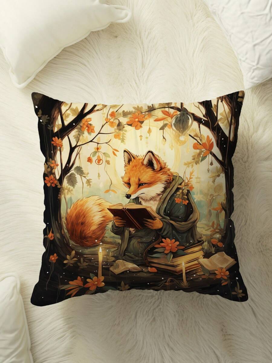 1pc Vintage Fox Reading Book Pattern Throw Pillow Case, Fairy Tale Illustration Style, Four Seasons, No Pillow Insert