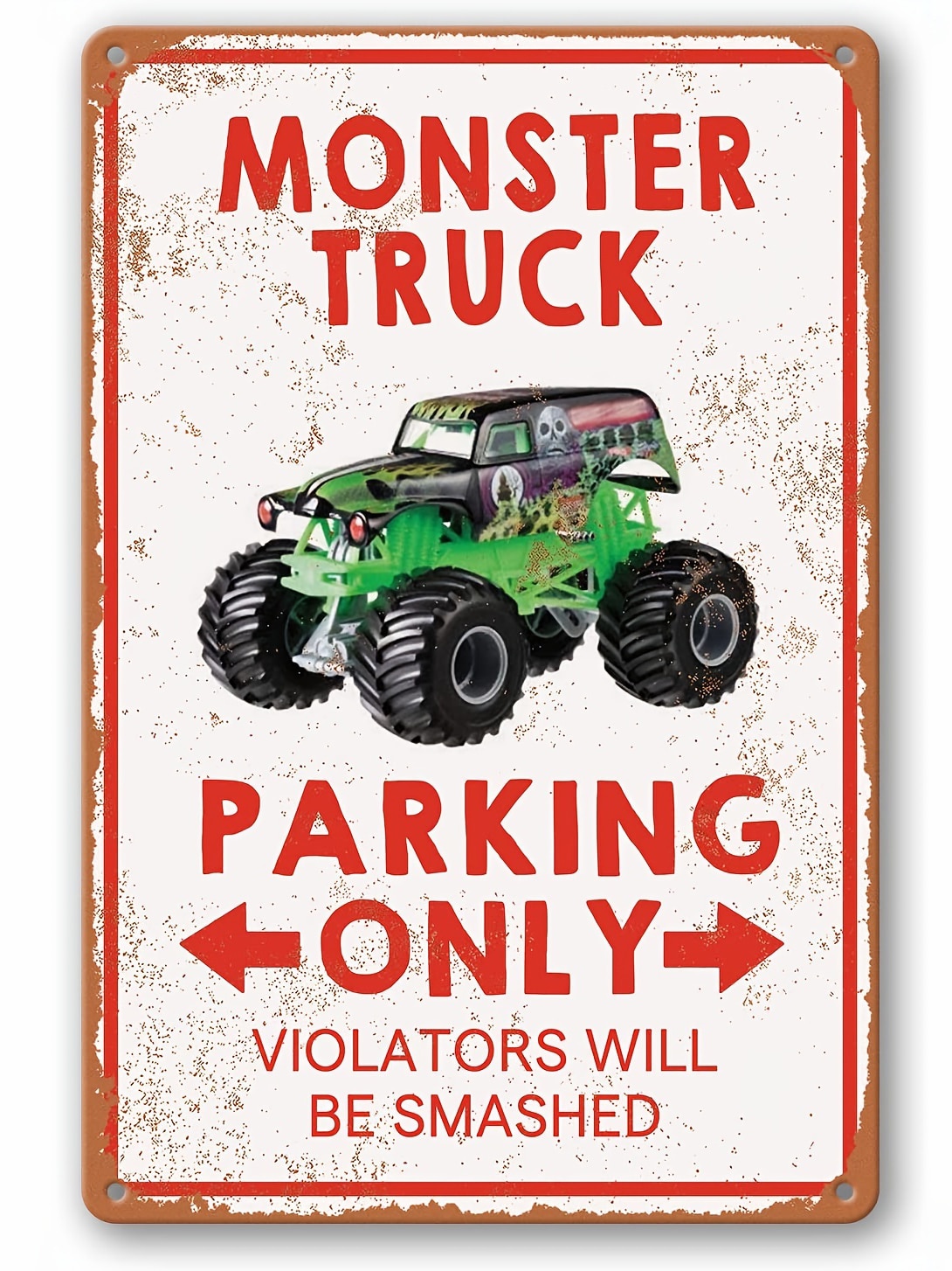 1pc Vintage Metal Tin Sign Room Decor For Boy With Truck & Monster Jam Theme, Ideal For Boy's Birthday Party Or Bedroom, Sign Reads: 'monster Truck Parking Violators Will Be Smashed', Wall/door Decor Accessory, Size: 12x8 Inches