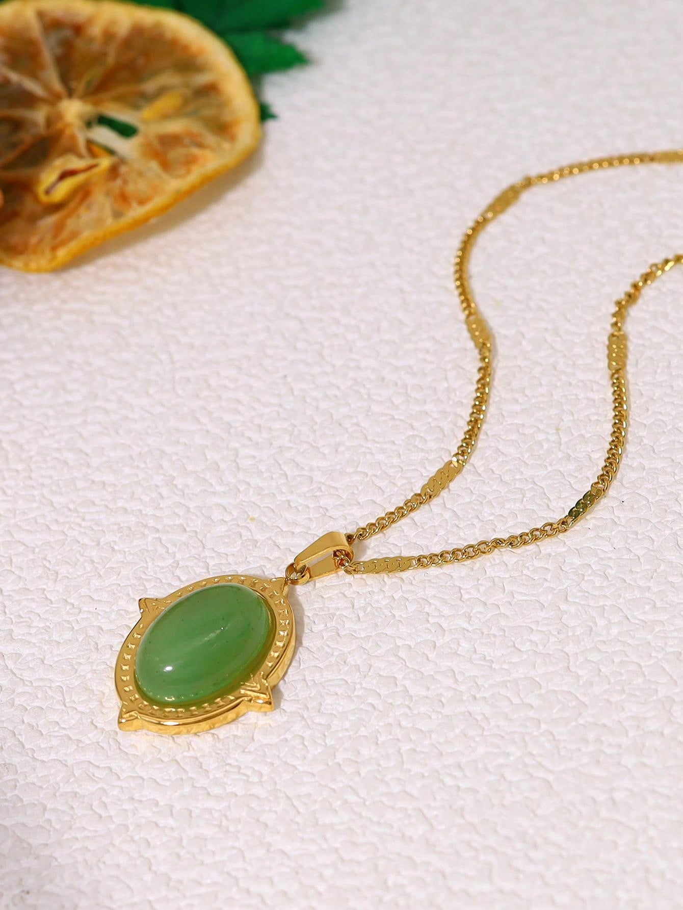 1pc Vintage Oval Shaped Natural Stone Inlaid Titanium Steel Pendant Necklace 18k Plated Choker Chain