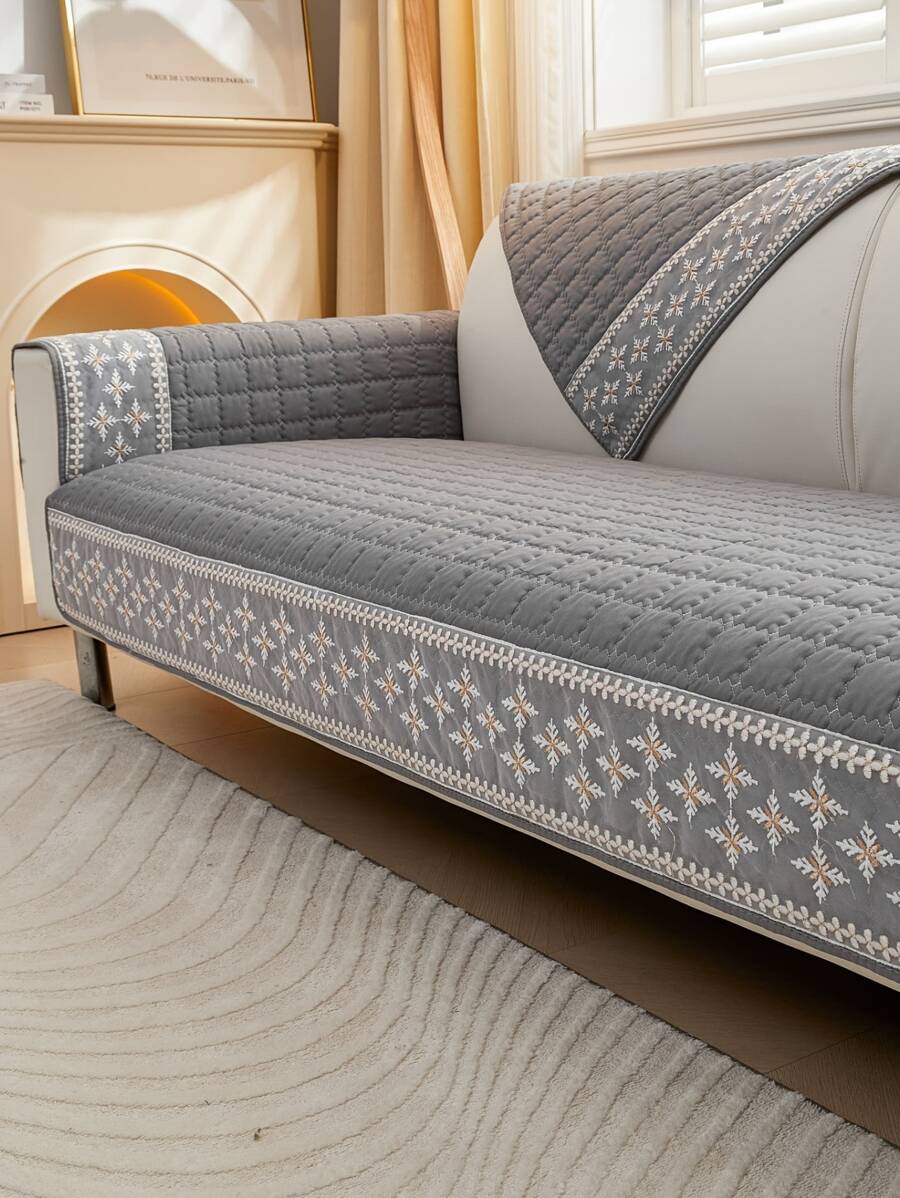 1pc Waffle Quilting Anti-Slip Sofa Cover With Snowflake Decor, Couch Cover Blanket