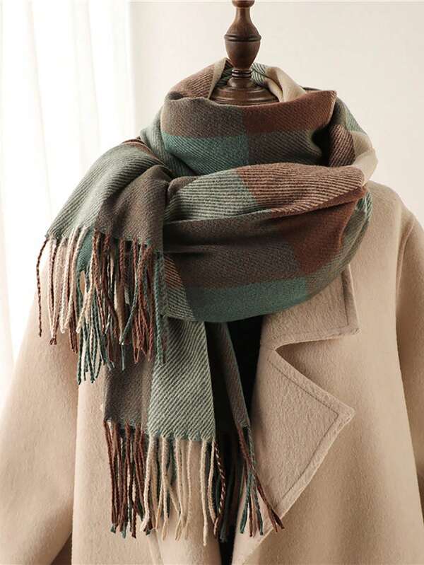 1pc Warm And Comfortable Plaid And Striped Scarf With Tassel For Daily Wear