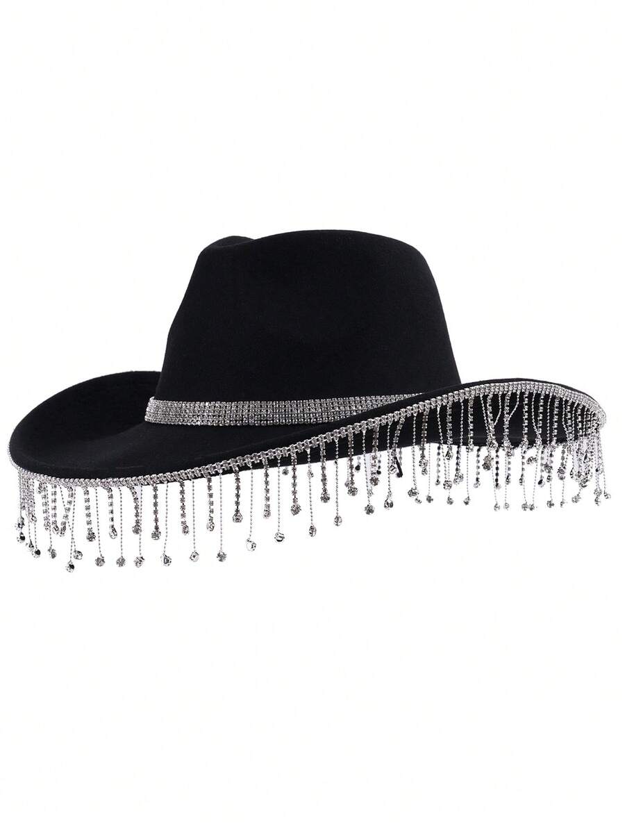 1pc Western Style Cowboy Hat With Large Brim, Rhinestone & Tassel Decor, Suitable For Autumn And Winter, Performances, Parties
