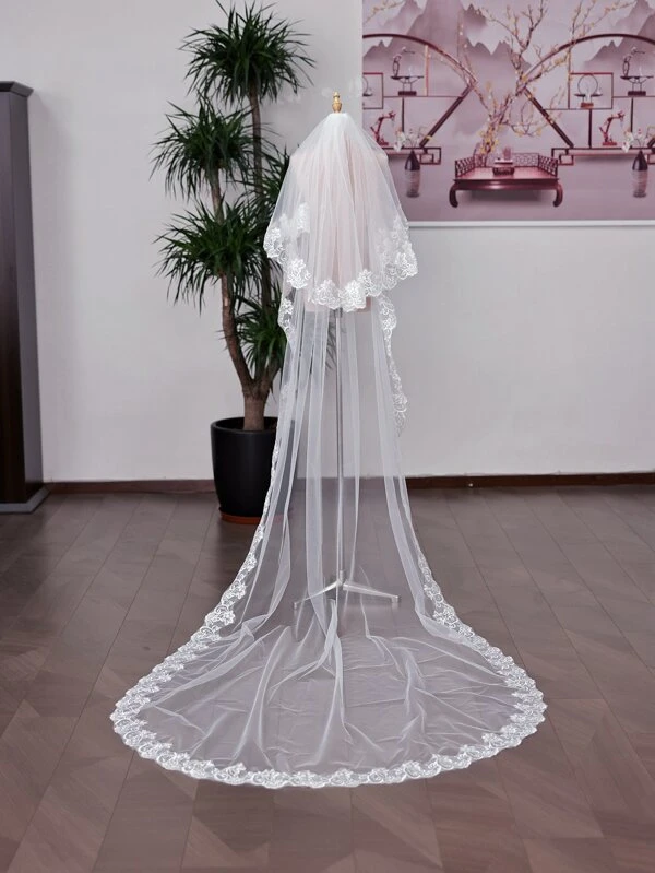 1pc White Fashionable Bridal Wedding Party Hair Comb Long Lace Veil With Trail