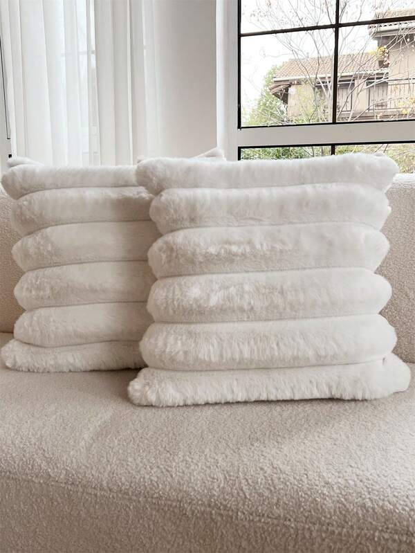 1pc White North European Style Coarse Stripe Pattern Polyester Fleece Pillowcase Imitation Rabbit Fur Large Drawstring Sofa Cushion Cover For Living Room Home Decor