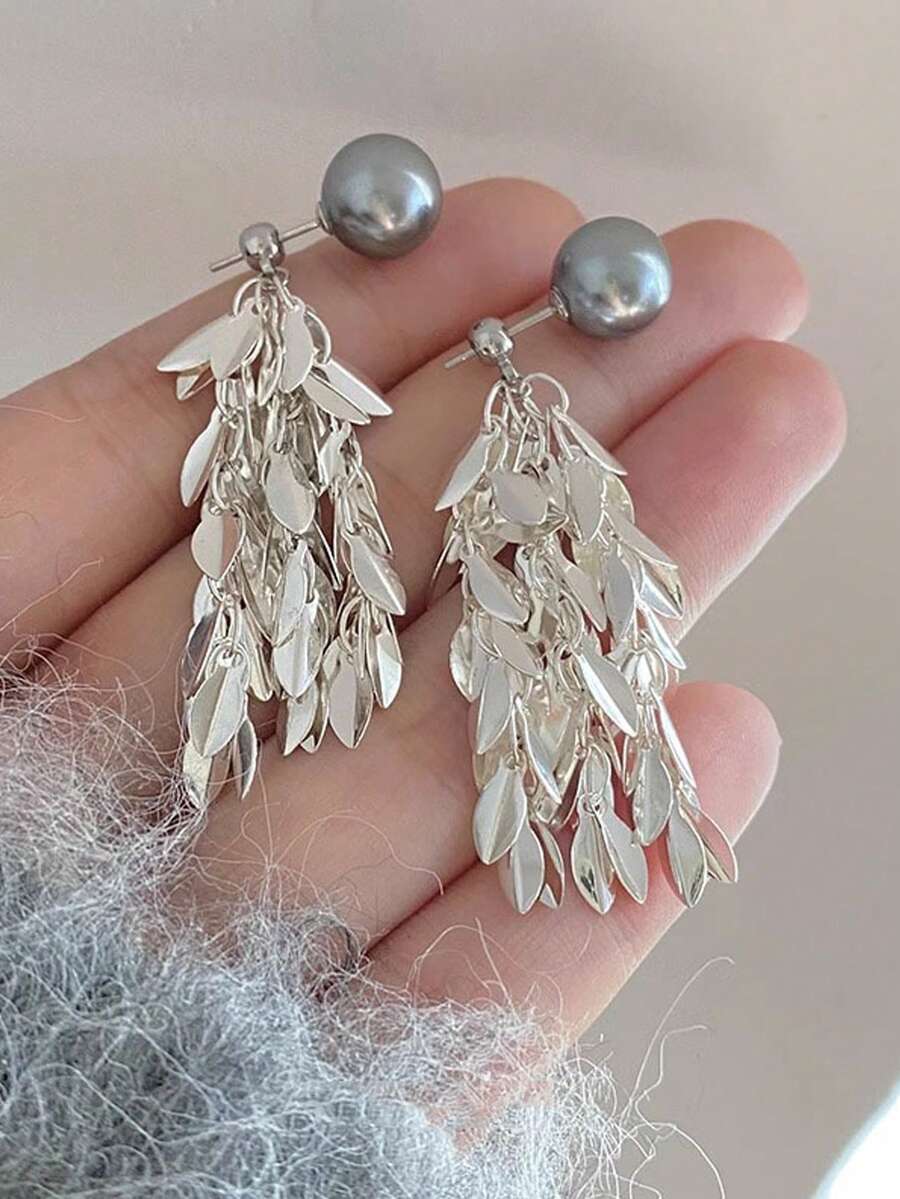 1pc Women'S Grey Iridescent Pearl Fringe Earrings Perfect For Autumn/Winter,An Exquisite Earwear That Can Be Worn In Two Ways To Highlight Facial Features