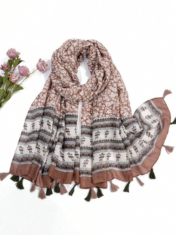 1pc Women'S Multicolor Fashionable Striped Floral Print Fringe Scarf Shawl, Suitable For Daily Commute And Outwear