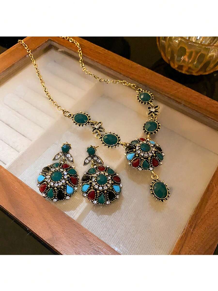 1pc Women'S Multicolor Rhinestone Inlaid Flower Shaped Necklace And Earrings Set, Suitable For Daily Wear