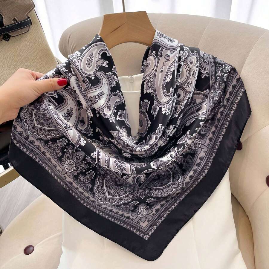 1pc Women'S Vintage Black Paisley Pattern Silk Scarf 90x90cm Square Outdoor Headband/Headscarf