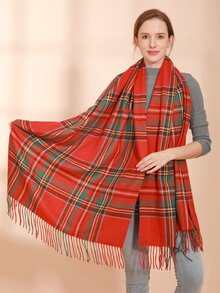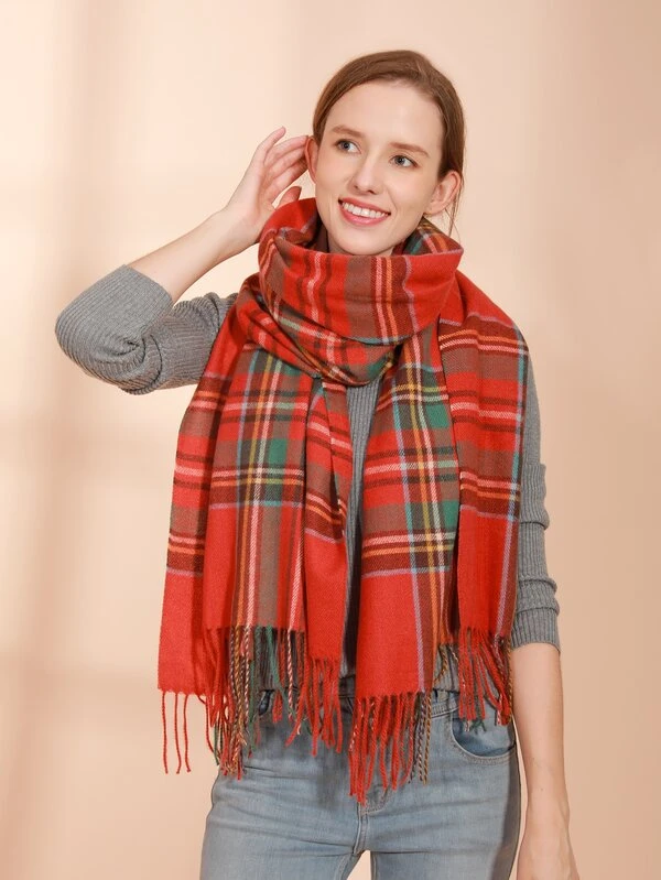 1pc Women'S Warm Winter Plaid Knitted Scarf With Tassel And Shawl, British Style, Christmas Decoration, Suitable For Christmas And Daily Wear