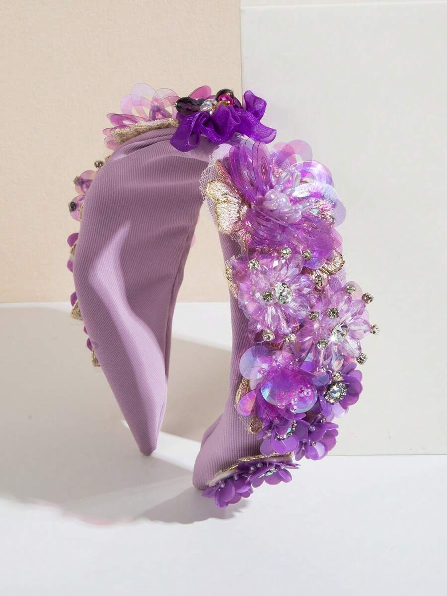 1pc Women'S Wide-Brimmed Purple Flower, Crystal & Gemstone Decorated Party Headband