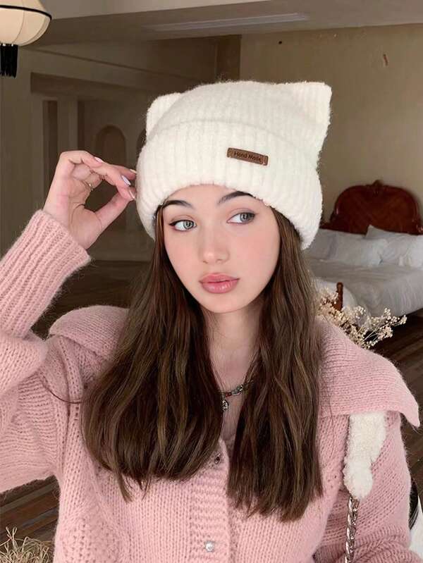 1pc Women'S Winter Knit Hat, With Cute Cat Ears, Thick Rolled Brim And Fleece Lined, Suitable For Keeping Warm In Autumn And Winter
