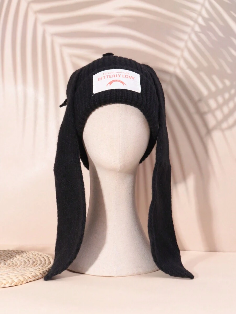 1pc Women's Black Acrylic Stylish Accessory European And American Style Knitted Hat With Long Bunny Ears For Parties And Daily Wear
