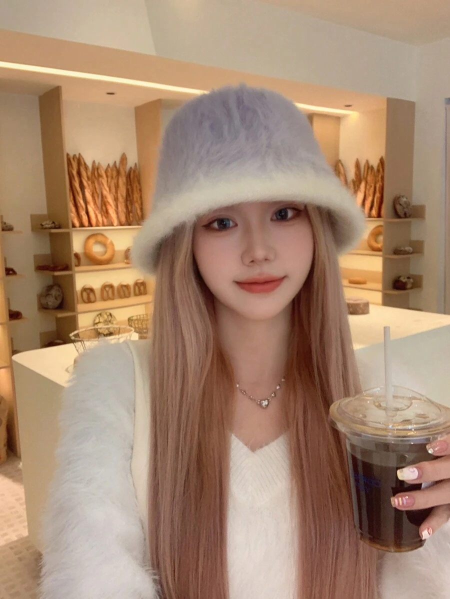 1pc Women's Face-shaping Rabbit Fur Fisherman Hat, Autumn & Winter Warm Wide-brim Bucket Hat, Solid Color Plush Cap