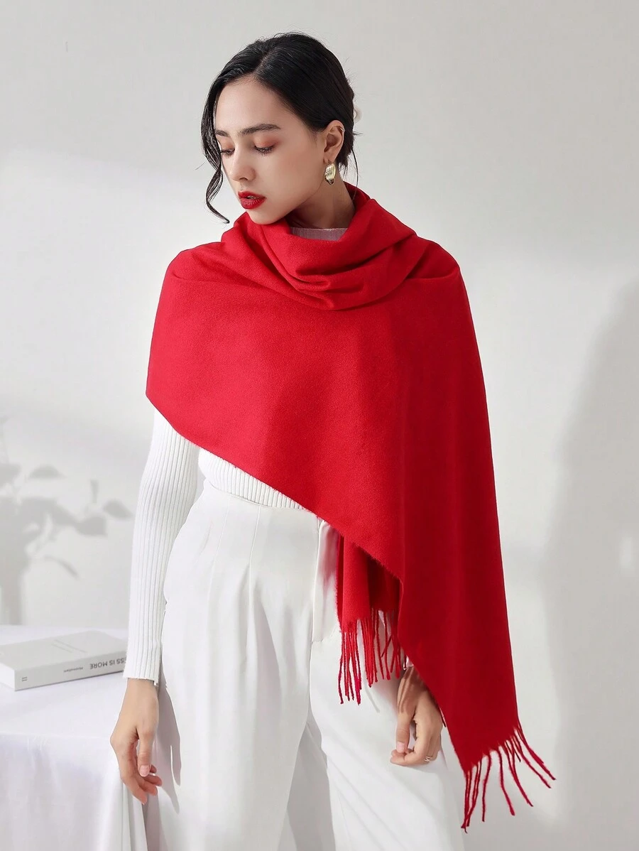 1pc Women's Pure Red Fringed Faux Cashmere Warm And Versatile Plus-size Scarf Shawl Suitable For Daily Use