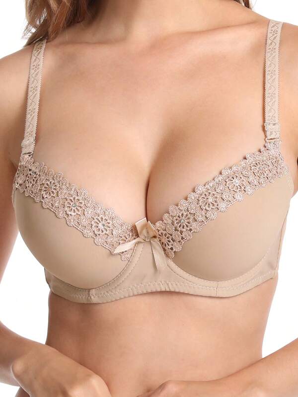 1pc Women's Thick Padded Push Up Bra With Embroidery Trim, Beige