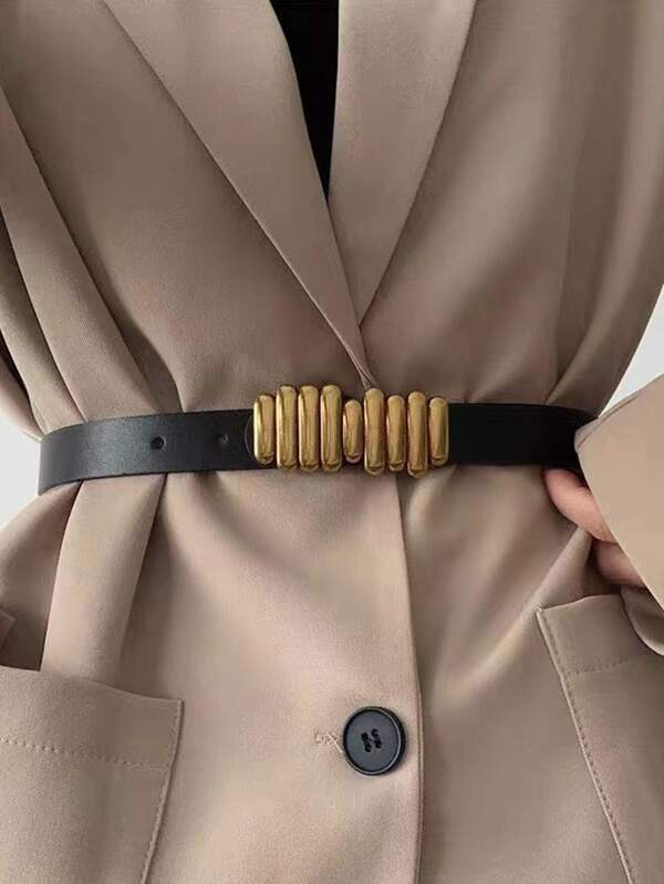 1pc Women's Vintage Pu Belt With Gold Buckle Decor, Fashion Accessory For Dress Or Coat