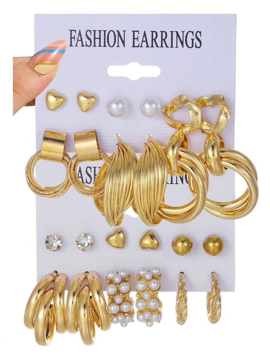 1set 12pairs Women'S Multicolor C Shaped Geometrical Heart, Faux Pearl & Rhinestone Decor Iron Stud Earrings Set, Suitable For Daily Wear