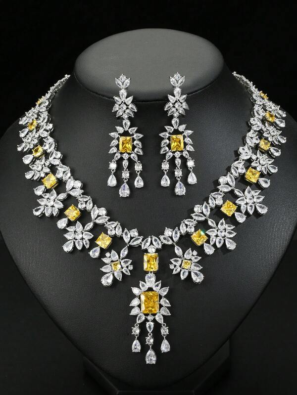 1set 3pcs European, American And Style Necklace And Earrings Set With Flower Decoration, High-End Wedding Or Banquet Jewelry For Women'S Festival Wear