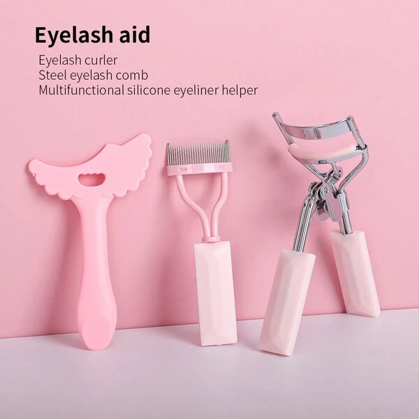 1set 3pcs Pink Portable Eyelash Helper Kit Including Eyelash Curler And Comb And Steel Needle, Suitable For Daily Makeup, Suitable For Women And Girls