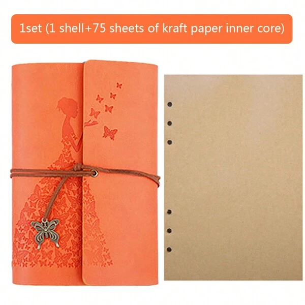 1set Creative Japanese & Korean Style A6 Notebook With Skirt Girl & Butterfly Pendant, Ring Binder, Planner, Vintage Stationery Leather Cover Blank Loose-Leaf Inner Pages